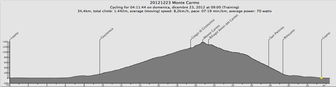 Da Loano si prosegue in direzione Pietra Ligure per circa 2 km per poi svoltare a sinistra nella valle del Torrente Maremola. Si risale fino all’abitato di Tovo San Giacomo dove, attraversato un ponticello la strada sale ripida (circa 1 km alla pendenza media del 16%!) dapprima su asfalto e poi su fondo sterrato. Dopo un breve tratto in discesa, inizia la lunga salita che conduce al Giogo di Giustenice, quasi 10 km alla pendenza media dell’11% (con punte che sfiorano il 20%). E’ possibile fare rifornimento d’acqua presso una fontana poco dopo la quale si trova il bivio per il Rifugio Pian delle Bosse che lasceremo alla nostra sinistra. Percorriamo i restanti 200 m di dislivello per arrivare al Giogo di Giustenice, punto tappa dell’Alta via dei Monti Liguri e base di partenza per l’ascesa al Monte Carmo, spingendo le bici a causa dell’abbondante neve presente sulla strada.