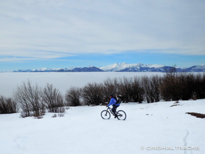 Decidiamo, così, di ritentare l’ascesa alla vetta in MTB, riuscendo, questa volta, nell’impresa e percorrendo una delle più lunghe, belle e suggestive discese dell’intera Provincia, il tutto condito da un’atmosfera surreale fra fitte nebbie, neve e panorami mozzafiato.