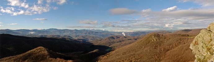 Alle spalle del Mar Ligure la val Bormida è la prima valle della cerchia alpina, trovandosi a cavallo del colle di Cadibona, limite geografico di distinzione tra le Alpi e gli Appennini. A partire dal colle, in senso orario, il territorio è delimitato dal lungo crinale di monti parallelo alla costa che da Altare al colle dello Scravaion, passando per il valico del Melogno (1028m) ed il massiccio del Monte Carmo (1389m), delimita per decine di chilometri lo spartiacque tirrenico padano. E’ qui che l’Alta Via dei Monti Liguri attraversa la zona più boscosa d’Italia fra le maestose faggete della Barbottina e dell’Adelasia. Dirigendosi deciso verso Nord il crinale delimita il confine fra Liguria e Piemonte costeggiando la val Tanaro e lasciando spazio ai boschi di roveri ed ai vigneti della bassa Langa. Il paesaggio è ora più dolce e meno selvaggio ed è disseminato di innumerevoli paesini che testimoniano un’ancora viva realtà contadina radicata nei secoli. Dopo la confluenza delle due Bormide, quella di Millesimo e quella di Spigno, si trova Acqui Terme meta obbligata per chi è alla ricerca di benessere e relax. E’ qui che la Bormida unisce le proprie acque a quelle del torrente Erro, sgorgate dalle sorgenti del massiccio del Montenotte. Il crinale torna a salire e fra dedali di calanchi ritrova la vista del mare sulla vetta del Monte Beigua (1287m).